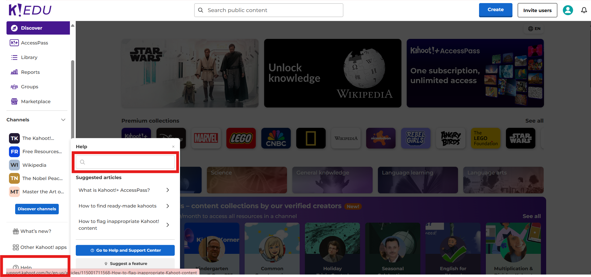 อาจารย์สามารถค้นหาหัวข้อที่ต้องการได้ที่เมนู Help บริเวณมุมซ้ายล่างสุด ระบบจะนำหัวข้อที่เกี่ยวข้องมาให้ หรือ เข้าชมข้อมูลเพิ่มเติมได้ที่ Kahoot! Help & Resource Center ที่ <https://support.kahoot.com/hc/en-us>