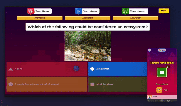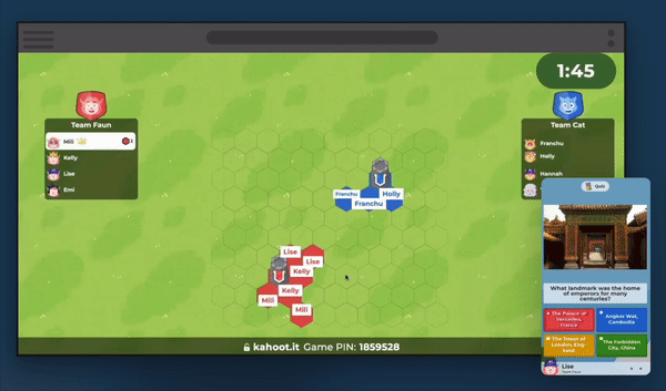 โหมด Team ใน Kahoot! ส่งเสริมการทำงานร่วมกัน โดยเปิดโอกาสให้ผู้เล่นรวมทีมแข่งขันได้ มี 2 รูปแบบ ได้แก่ Shared Devices (ใช้เครื่องร่วมกันภายในทีม) และ Personal Devices (ใช้เครื่องส่วนตัวของแต่ละคน) เหมาะสำหรับกิจกรรมกลุ่ม และช่วยเสริมสร้างประสบการณ์ด้านการทำงานเป็นทีมได้อย่างดี
