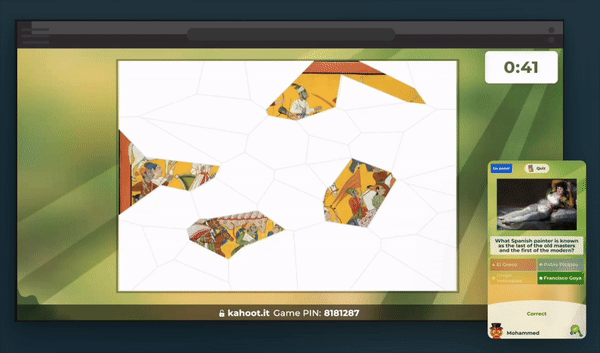 โหมดเกม Chill Art ใน Kahoot! เปิดโอกาสให้ผู้เล่นได้ผ่อนคลาย พร้อมร่วมกันค้นพบผลงานศิลปะอันงดงาม โดยการตอบคำถามให้ถูกต้องเพื่อสะสมพู่กัน ผู้เล่นทุกคนจะช่วยกันเผยภาพผลงานชิ้นเอกบนหน้าจอของผู้สอนหรือผู้จัดเกมร่วมกัน
