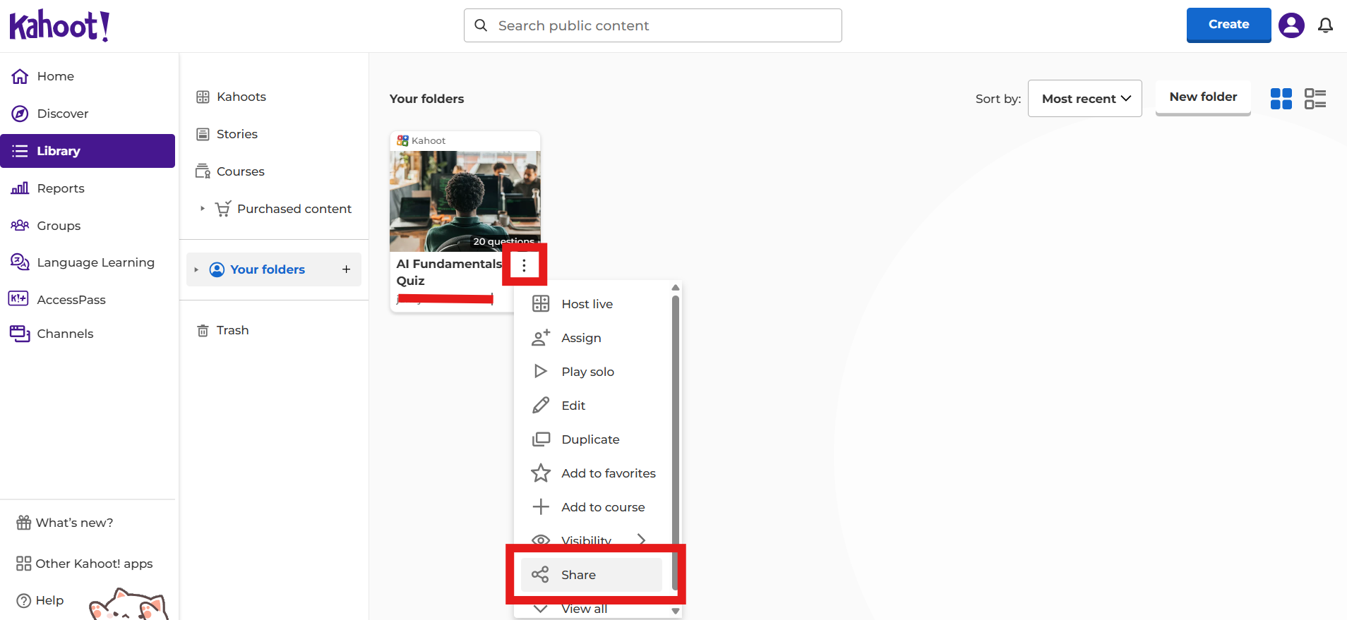 กดเครื่องหมายจุดสามจุดแนวตั้ง บริเวณหลังชื่อ kahoot ดังภาพประกอบ เพื่อเปิดเมนูย่อย แล้วเลือกเมนู Share