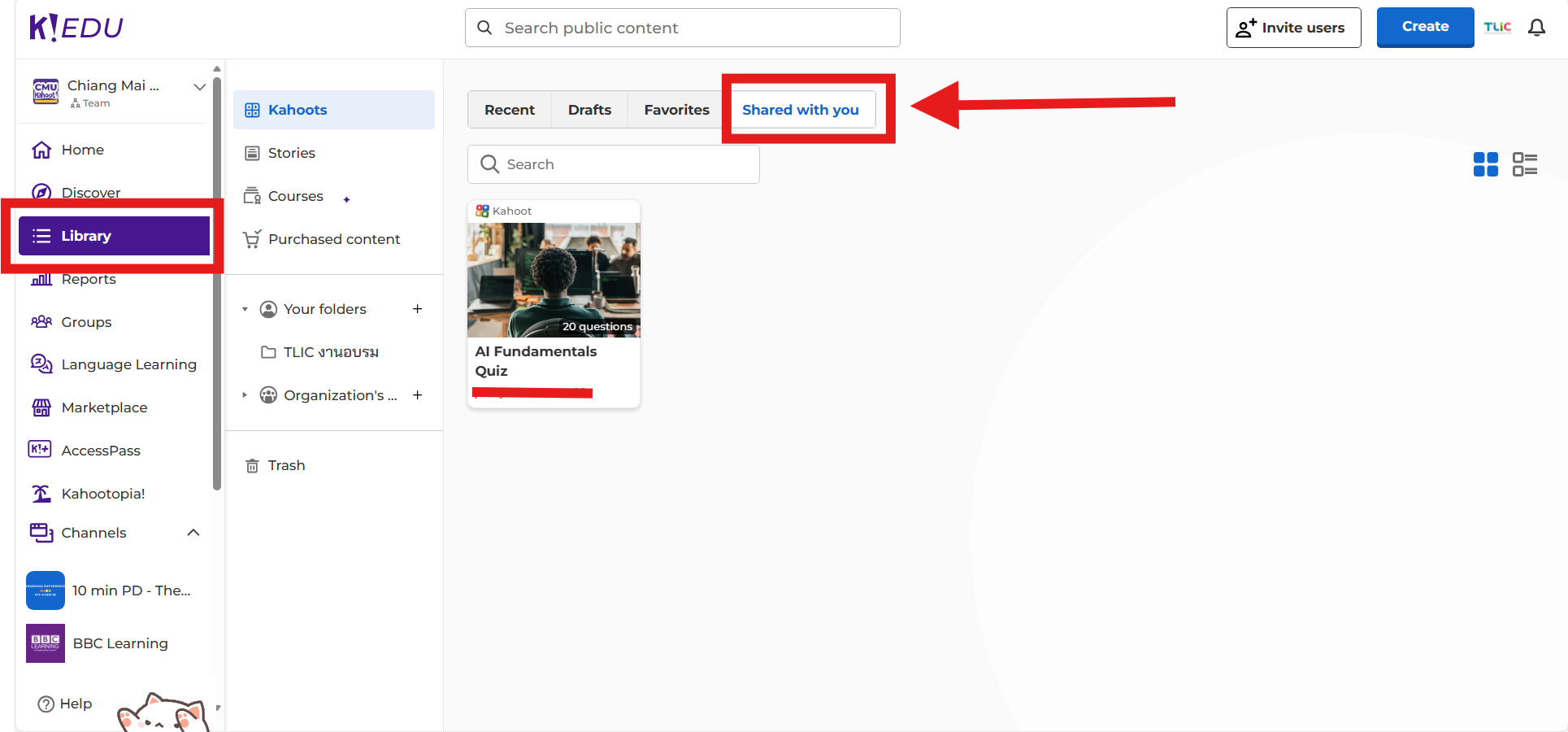 เมื่อเข้าสู่ระบบด้วย CMU Mail (Microsoft Login) แล้ว ให้ไปยังเมนู Library เลือกแถบ Shared with you จะปรากฏ kahoot ที่แชร์มาจาก id อื่นที่นี่