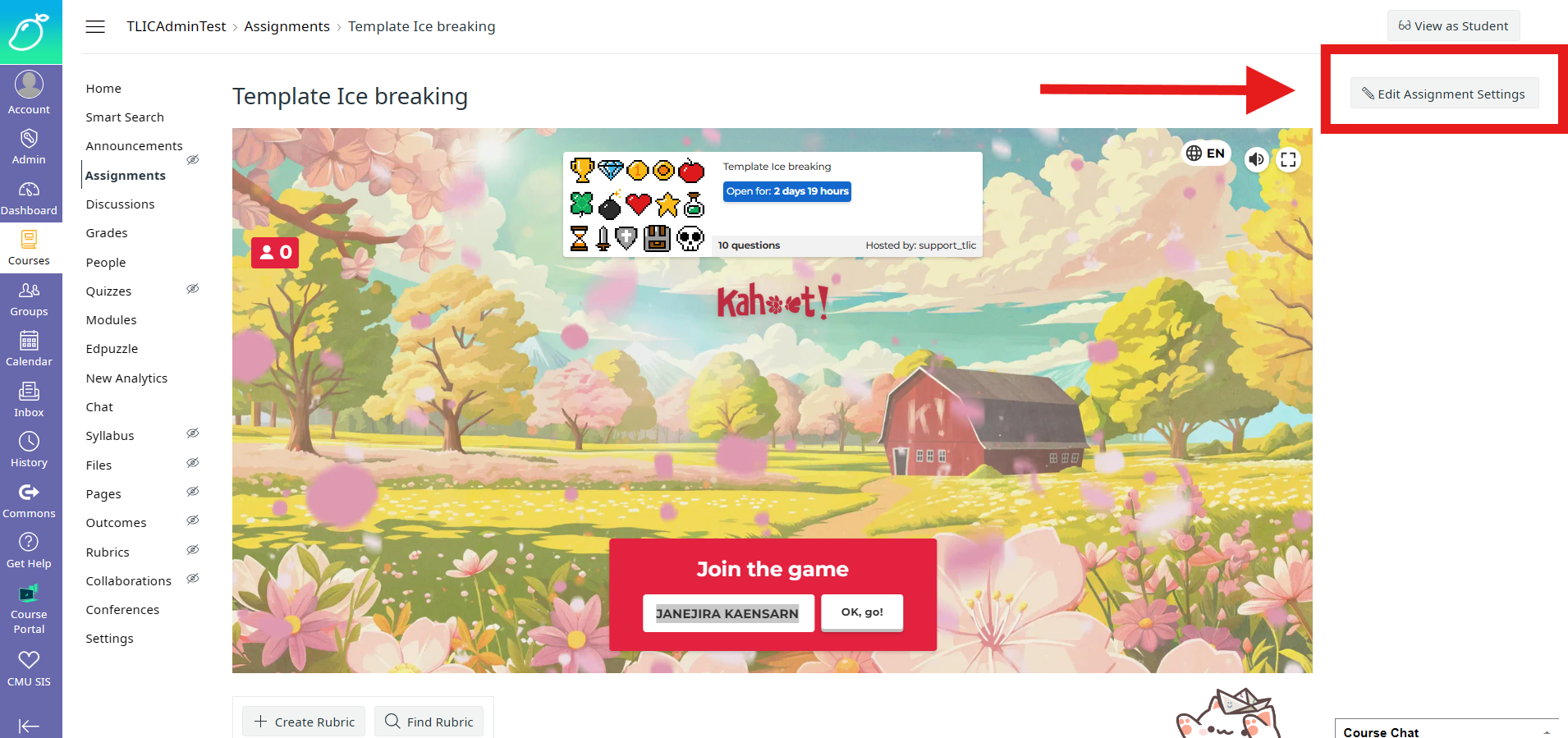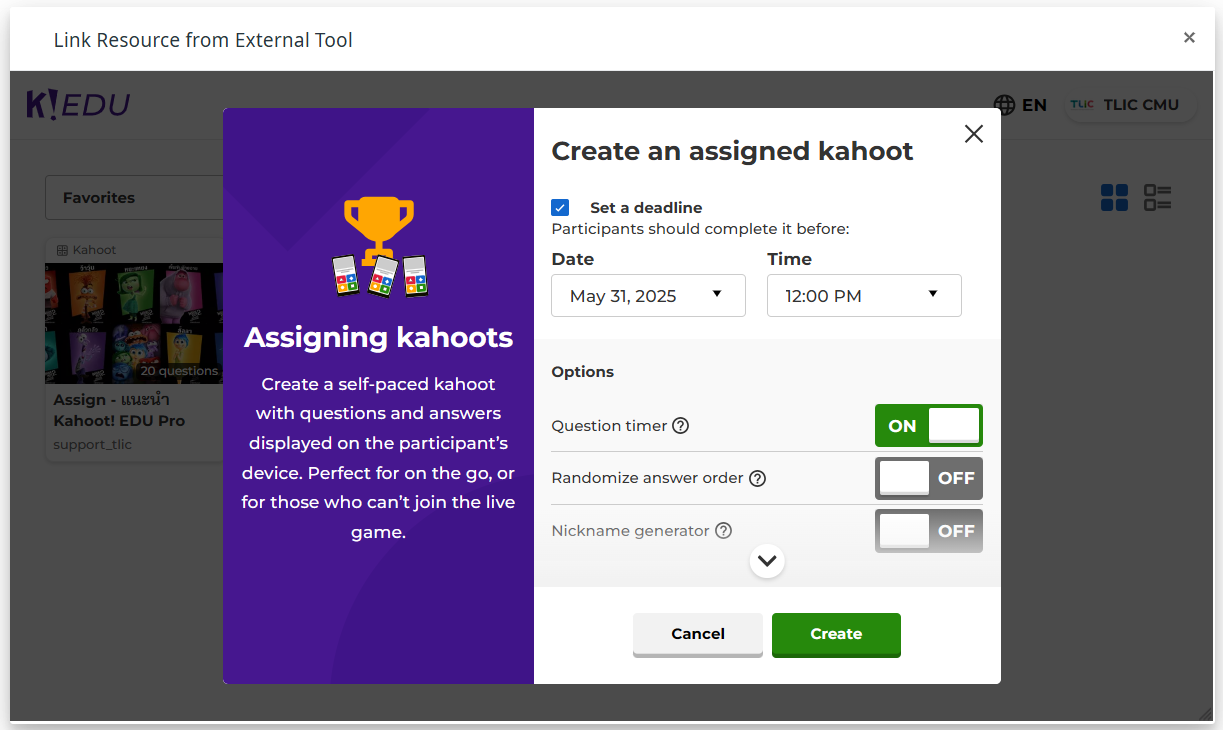 จากนั้นกดปุ่ม **Create** เพื่อสร้าง Assign Kahoot เข้ามายังMango Canvas