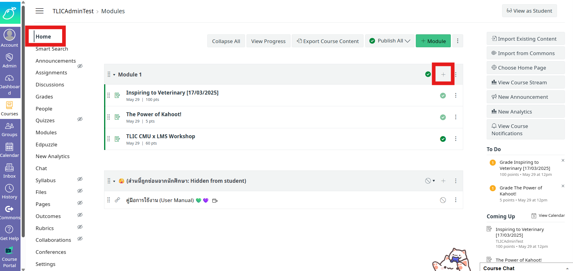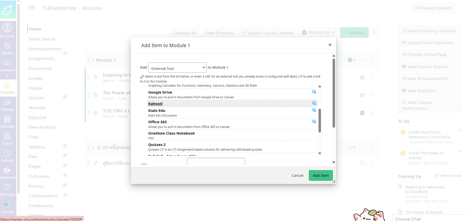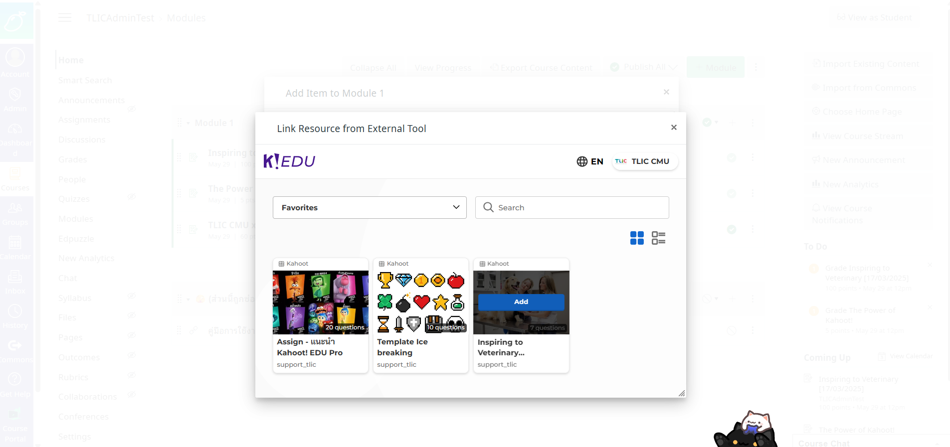 ## 2. เพิ่ม Kahoot โดยกดเครื่องหมายเลขบวก บริเวณมุมขวาบนของ Module