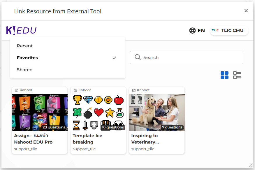 ท่านสามารถเลือกดู Kahoot ที่สามารถเพิ่มในระบบ Mango Canvas ได้จาก 3 หมวดหมู่คือ **Recent** หรือ Kahoot ที่สร้างล่าสุด, **Favorites** Kahoots ที่ท่านชอบและกด Favoritไว้, **Shared** Kahoot ที่แชร์กับท่าน