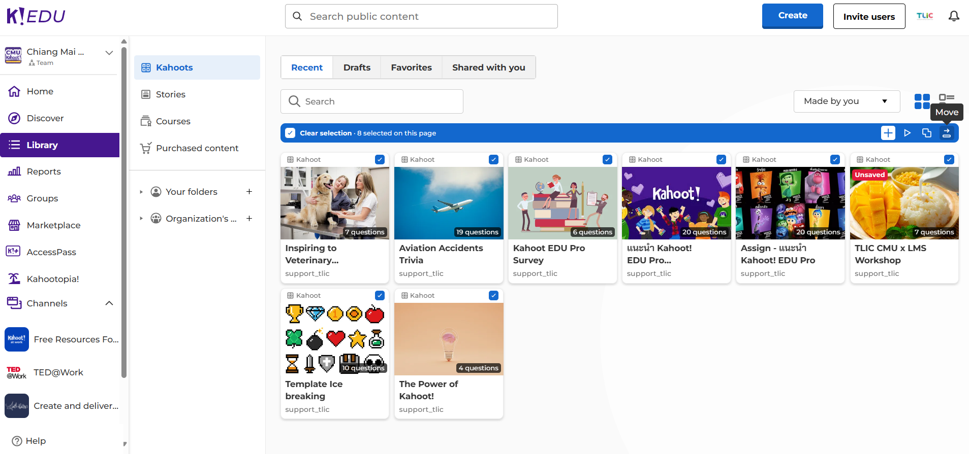 หลังจากนั้นให้เลื่อนเม้าส์ไปที่ Kahoot ที่ท่านต้องการย้าย กดเลือกทั้งหมด แล้วกด Move บริเวณแถบเมนูสีน้ำเงินมุมขวาบน