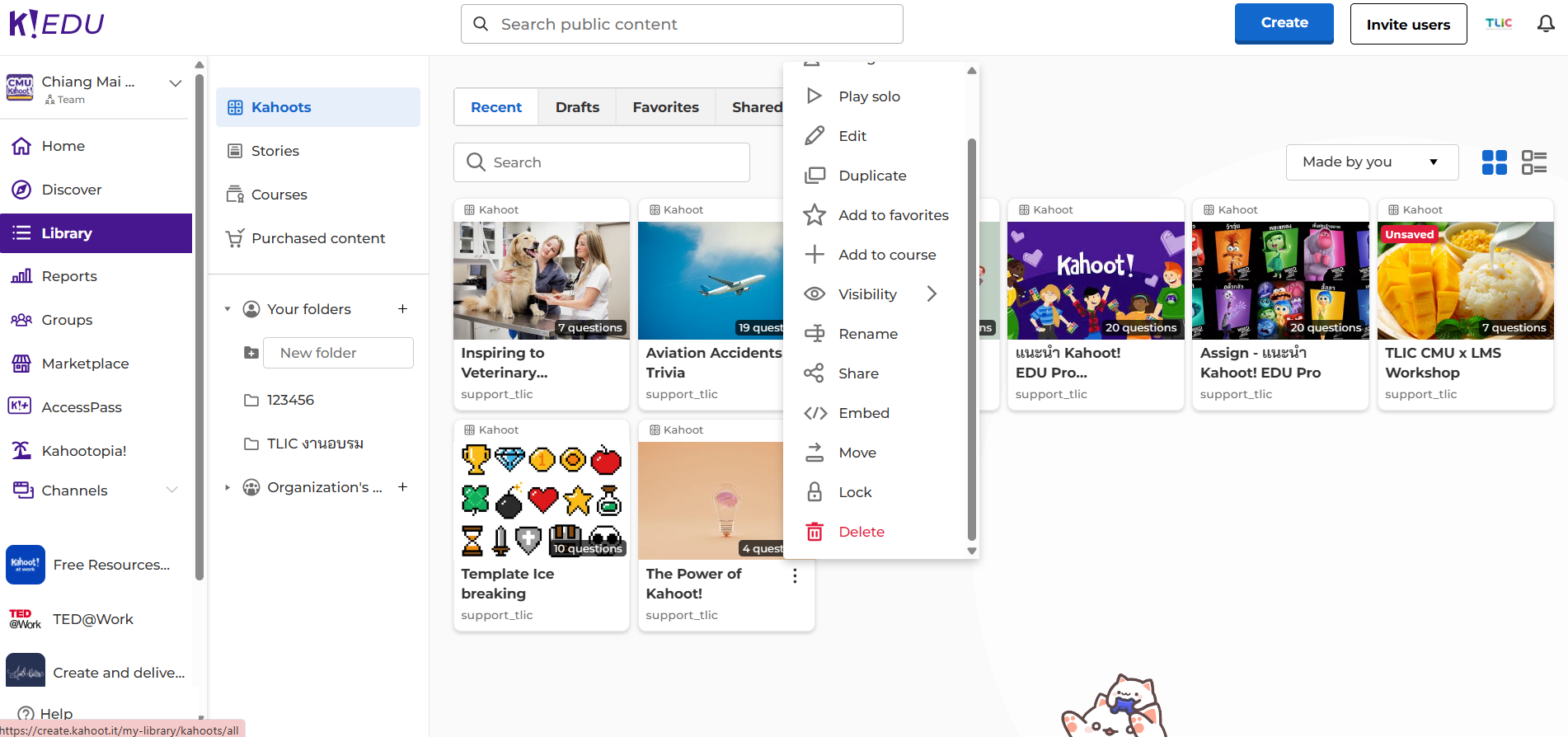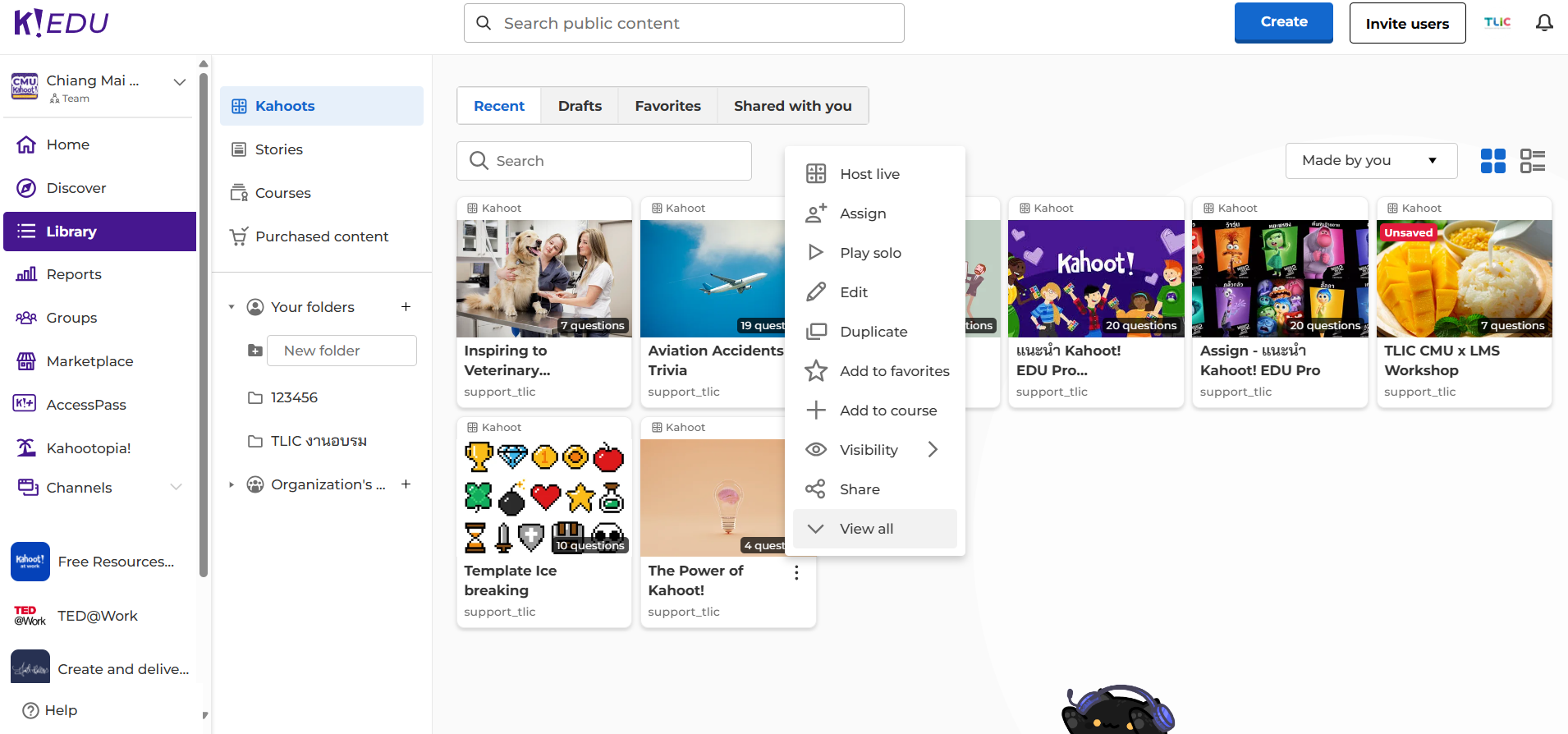 * นำไปแบ่งปันให้ทั้งองค์กร/สถาบันได้ใช้งานร่วมกัน: อาจารย์สามารถย้าย Kahoot ไปที่ "EDU Pro ขององค์กร/สถาบัน" (Organization Folders) ได้