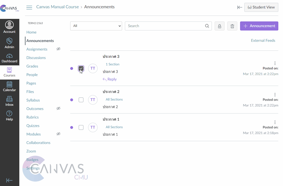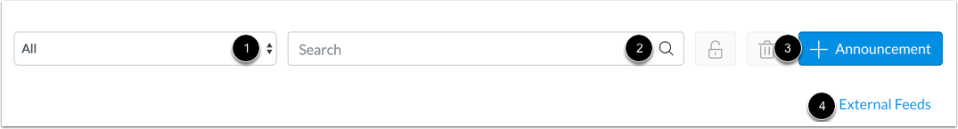 You can choose to display announcements by course or display announcements from all courses [1] and can search for the announcements you want in the search box [2]. In addition, you can also create a new announcement by pressing