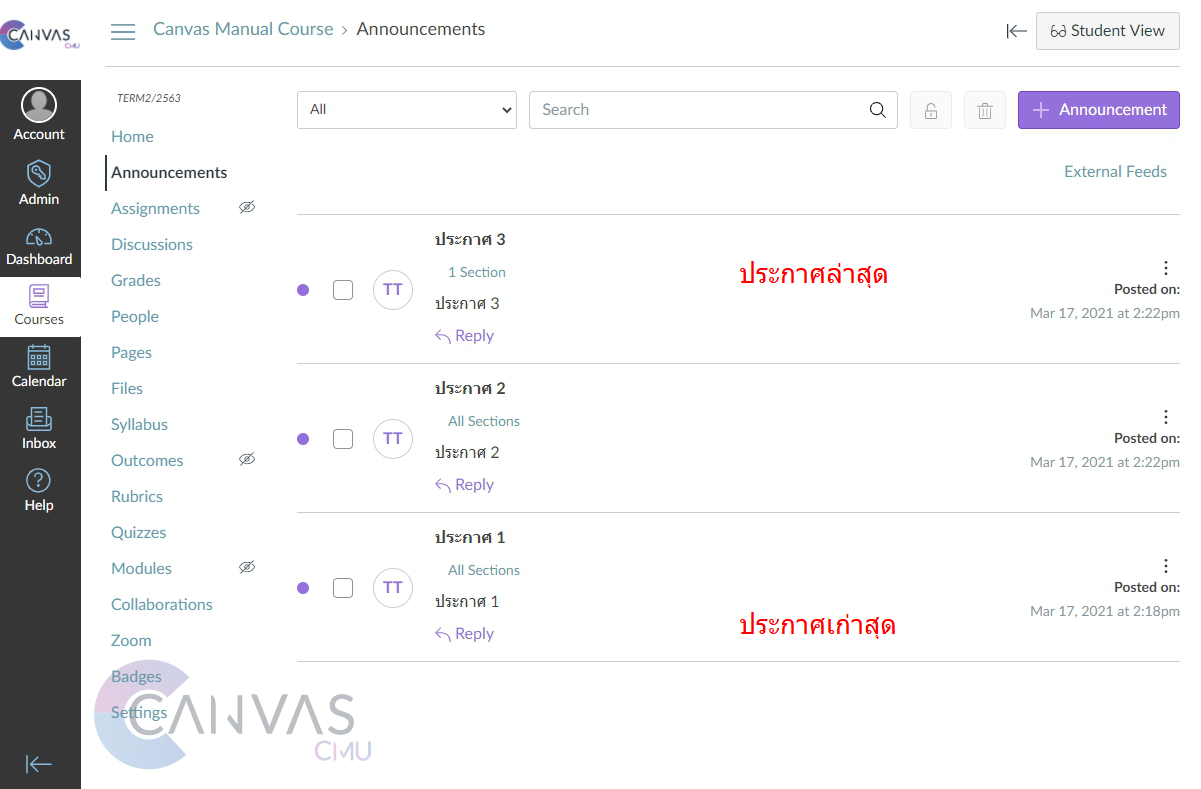The latest announcement will always be at the top. If it is a scheduled announcement, it will also be at the top, but will not be visible to students until the specified date and time. The system will then automatically post the announcement.