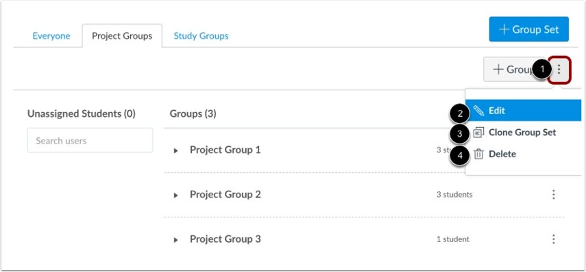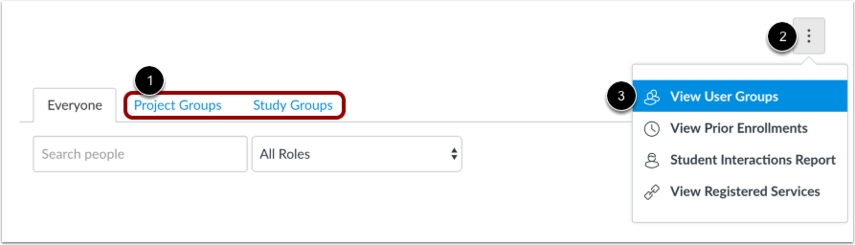 When a Group Set is created, it will be displayed on the top tab [1]. You can click on it to view the subgroups and the complete list. Additionally, you can click on the three-dot button [2] and select "View User Groups" [3] to open the first page of the Group Set and view the course.
