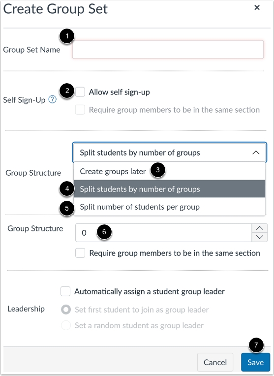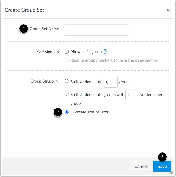 When creating a group set, name it [1], select 'I'll create group later' [2], then hit save [3].