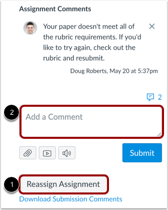 If the assignment/answer of the student needs to be returned for correction or resubmission, a button [1] will appear. The student will receive a notification on their homepage, and the instructor may write additional details for the student to understand the reason at [2].