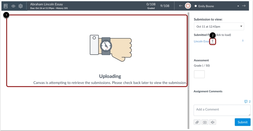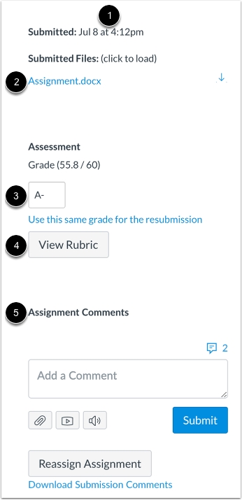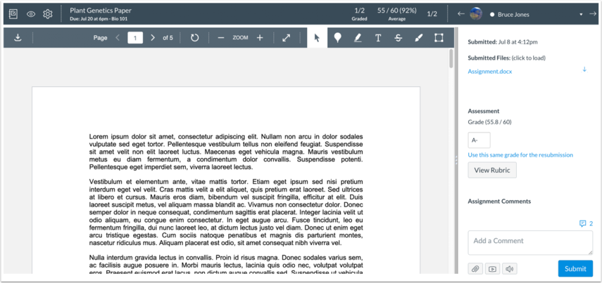 SpeedGrader displays all the information in the students' submissions for an assignment and saves it on the browser. This information includes the assignment or answer data, scores (both original scores and scores for newly submitted work), rubrics, and comments. This feature helps reduce the time it takes to load all the data and allows instructors to grade more efficiently without having to refresh the browser frequently.