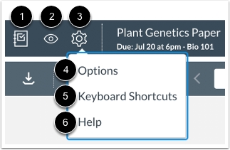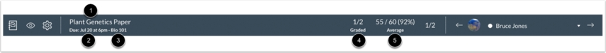In the top menu bar of SpeedGrader, there are tools that help facilitate easier grading. In the left corner, there are various features including: