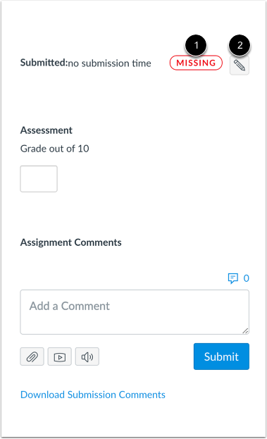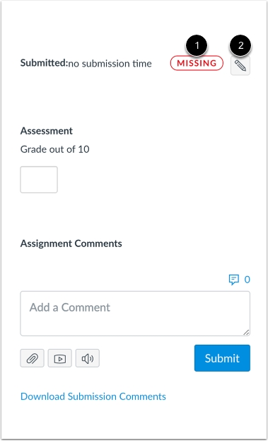 In the right-hand menu of SpeedGrader, you can view the status of the submission at [1], and instructors can change the status at [2]. The status options include Late, Missing, Excused, and None.