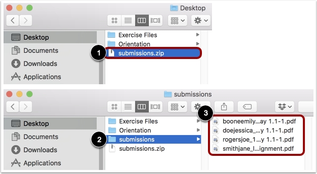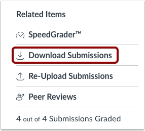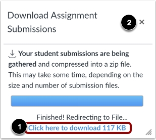 The downloaded files from the system will be in the format of a .zip file (requires a program to open). In the case of assignments that allow multiple submissions, the system will only include the latest submission.