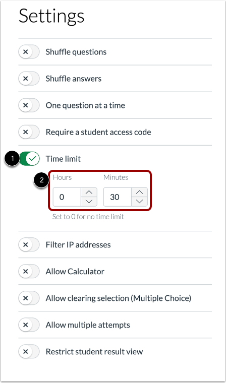 Set the time limit for doing the Quiz. The setting can be in hours and minutes.