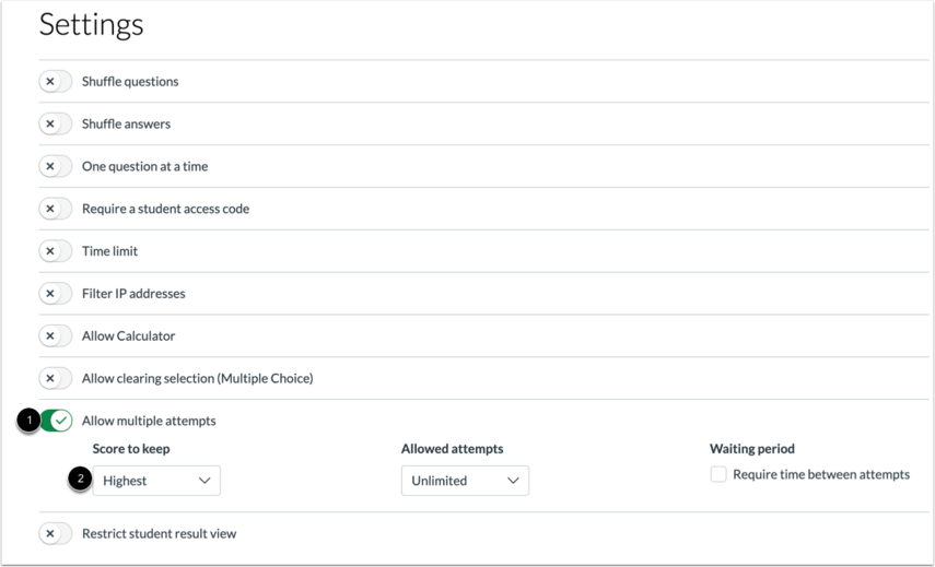 Limits the number of times a learner can take the Quiz. For example, they can take it twice. The score they receive is the highest score they achieve.