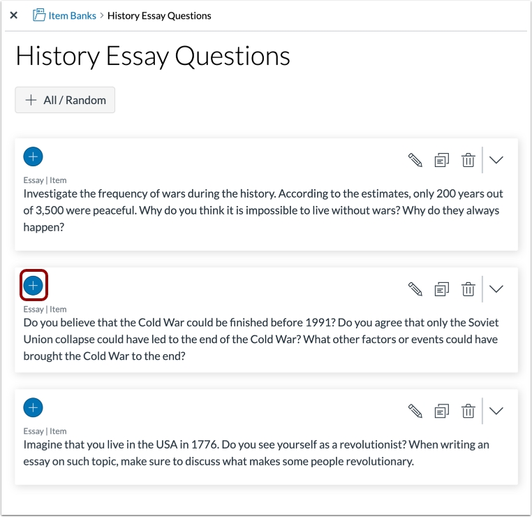 You can add questions from the question bank to New Quizzes, either one question at a time or multiple questions at once.
