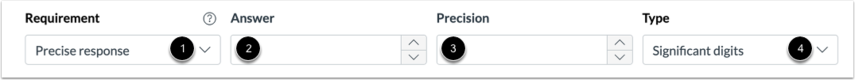 Select the 'Precise Response' at [1], enter the answer at [2], the accuracy value at [3], and the type of accuracy at [4]. The options for type of accuracy include significant digits and decimal places. Please note that precise Response does not support answers in scientific notation.