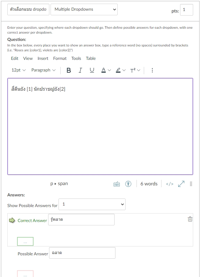 Answer Configuration: Type the answers in the blank spaces below according to the positions created. Number 1: "red", and Number 2: "violets". Example is shown in the image below (Thai).