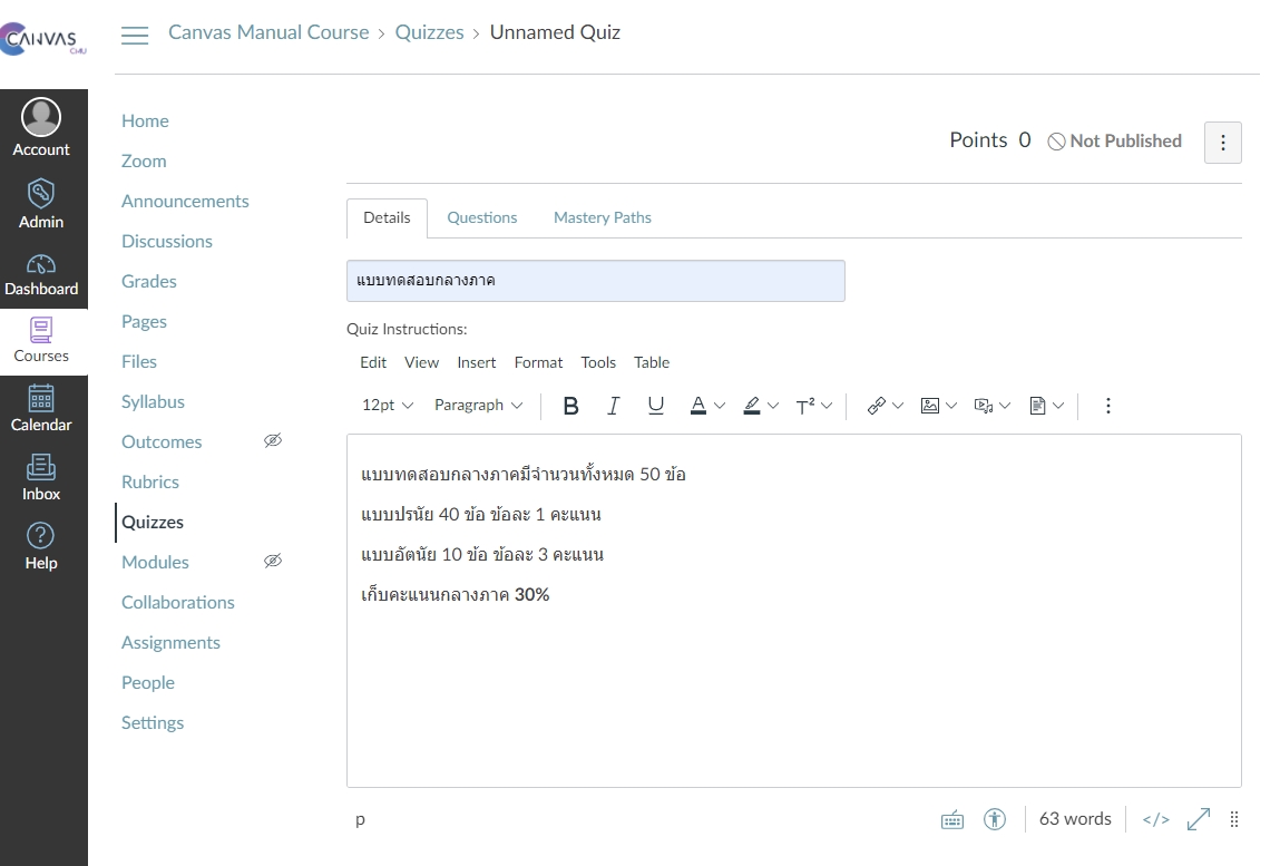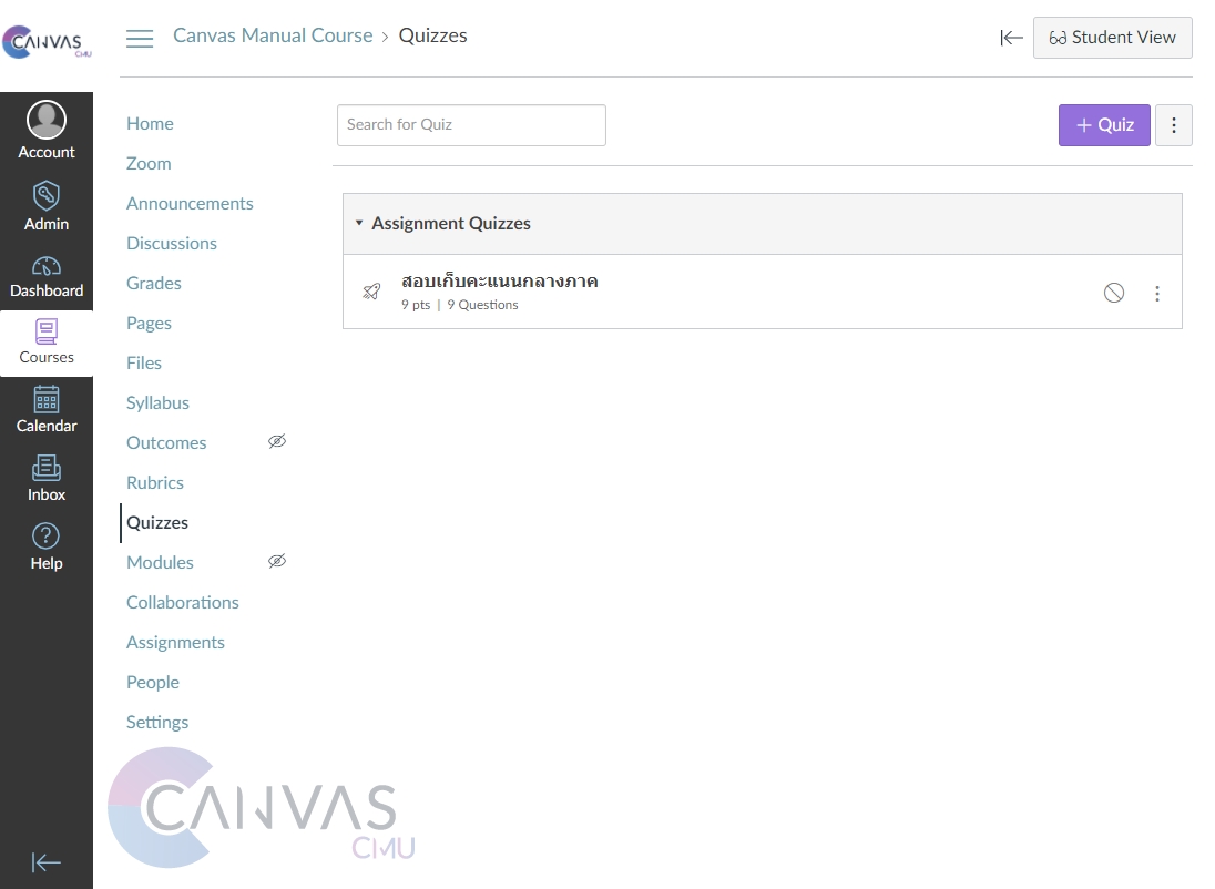 The Quizzes menu is used for creating exams or questions in various formats. The CMU Canvas system supports a total of 12 question formats, which will be discussed later. Before creating quizzes, there are three main things you need to know.