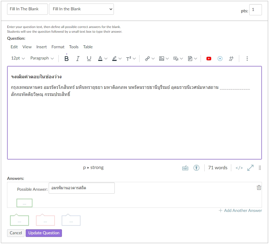 The Display Page of Fill In Multiple Blanks เรียบร้อยแล้ว  (student's view)