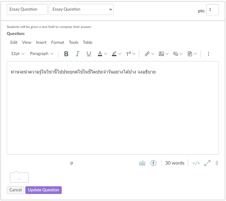 Question Score: You can assign a score to the question by editing the value in the space next to "pts:".
