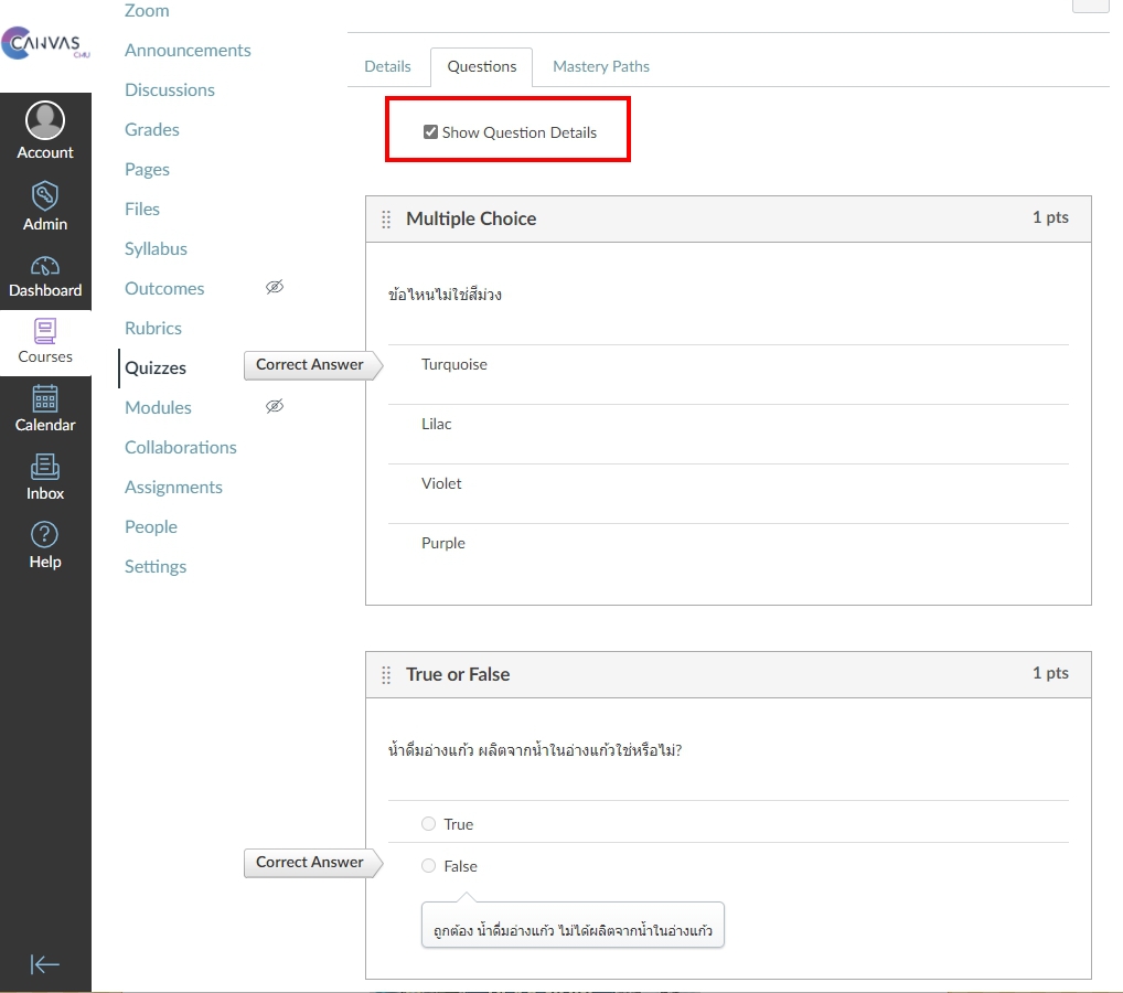 After creating a question, you can click "Show Question Details" to view the details of that question and its options without having to preview it.