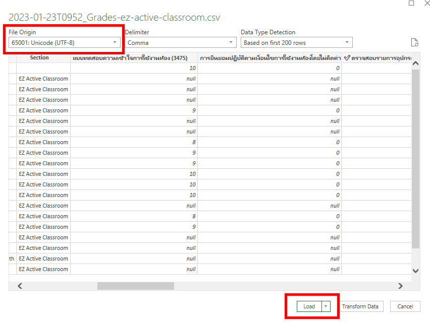 Choose the .csv file you wish to correct, and select '65001 Unicode (UTF-8)' from the File Origin options. After that, click 'Load'.