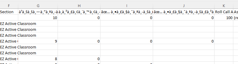 <figure><img src="https://content.gitbook.com/content/XHLtFtw2BeIo9EXwQ4kE/blobs/nzj58CD1CRlzpnl50KZC/image.png" alt=""><figcaption><p>ตัวอย่างไฟล์ Gradebook ที่ export ออกมาแล้วชื่อ Quiz เป็นภาษาต่างดาว</p></figcaption></figure>