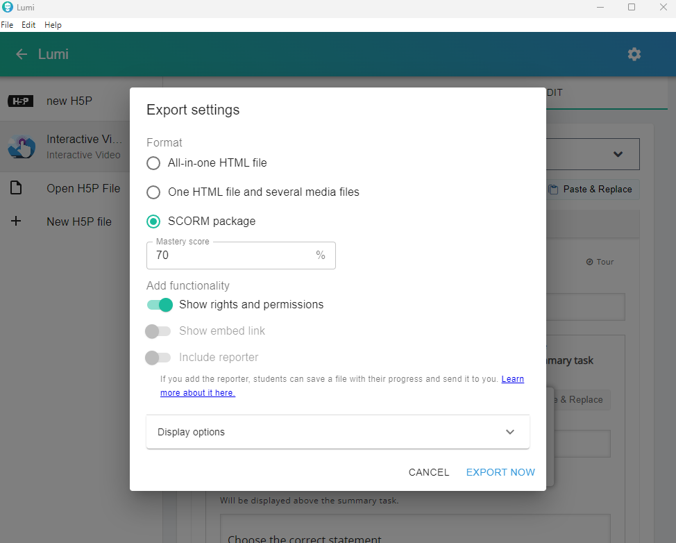After finalizing, click File >> Export >> select SCORM package >> EXPORT NOW.