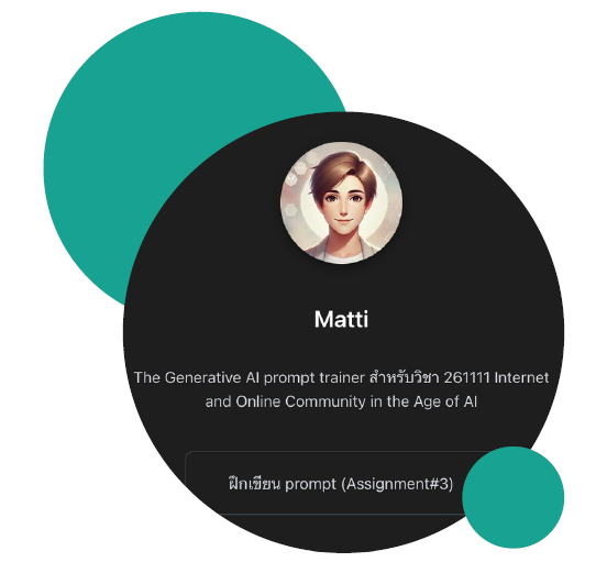 Matti และ Kathi คือ chatbot เวอร์ชั่น 1 และ 2 ซึ่งใช้ในภาคเรียน 1/67 และ 2/67 ตามลำดับ ทั้งสองรับหน้าที่เป็น Generative AI prompt trainer เพื่อให้นักศึกษาที่ลงกระบวนวิชานี้เรียนรู้และฝึกการสร้าง prompt  ด้วยลักษณะเป็นผู้ช่วยการเรียนรู้ (Facilitator) ใช้คำถามเพื่อไกด์ให้นักศึกษาคิดทบทวน และปรับปรุง prompt ให้ดียิ่งขึ้น<br>