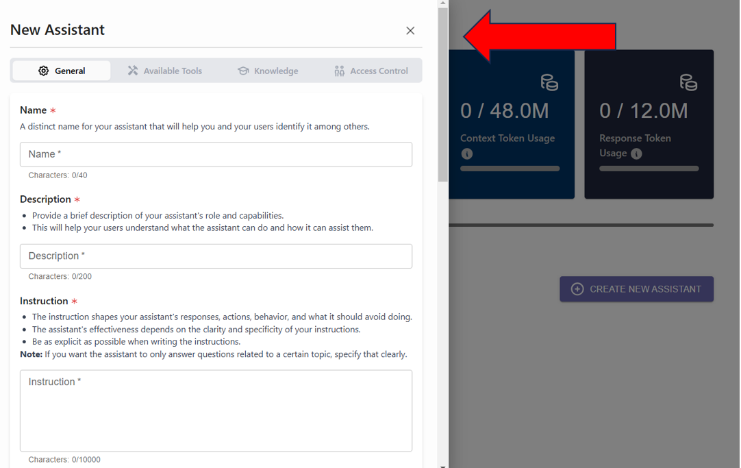 ## <mark style="color:red;">3. เมื่อเลือก  "CREATE NEW ASSISTANT" แล้ว</mark> <mark style="color:red;"></mark><mark style="color:red;">**New Assistance Setting**</mark> <mark style="color:red;"></mark><mark style="color:red;">จะปรากฏทางซ้าย</mark>&#x20;