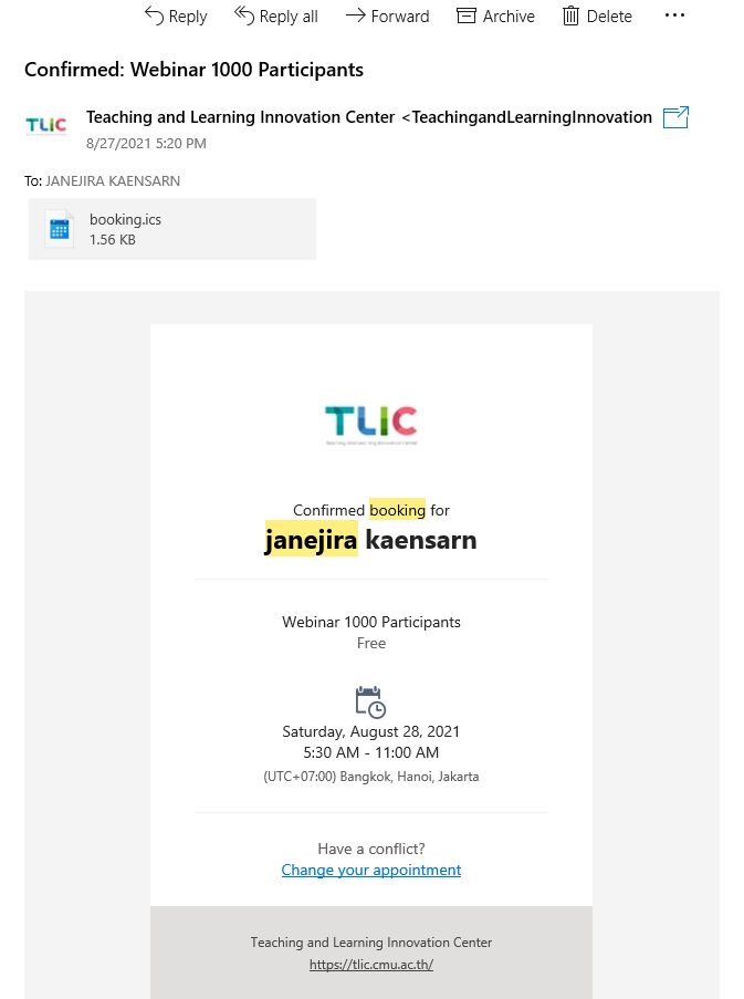 1. Once you have successfully made a reservation, you will receive an email notification with the date and time of your booking as shown in the image below. You can change the date and time of your booking or cancel the reservation by clicking the **"Change your appointment"** button. Then the system will take you to the information entry page and confirm again.