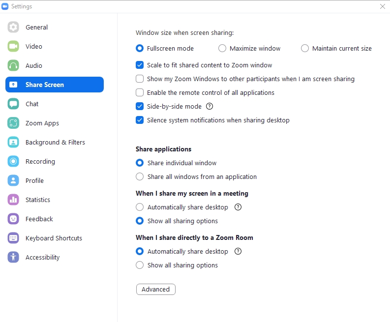 Window size when screen sharing : Fullscreen mode / Maximize window / Maintain current size