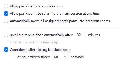 Allow participants to return to the main session at any time - When enabled, participants can exit breakout rooms and return to the main room at any time. If disabled, participants cannot exit breakout rooms until the host or co-host closes the breakout rooms.