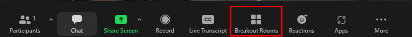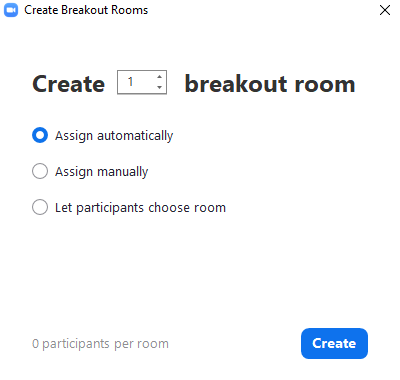 While in a meeting, you can create breakout rooms by selecting the 'Breakout Rooms' button located in the control bar. When you click on it, the breakout rooms creation window will appear.