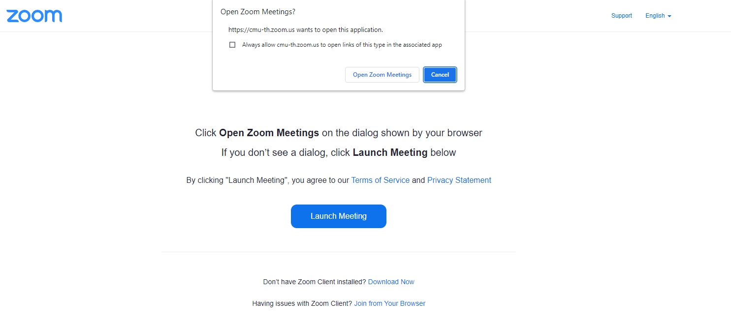 The system will prompt you to open the Zoom program. Select 'Open Zoom Meetings' and enter the meeting room immediately.