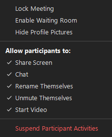 Suspend Participant Activities: Disable cameras, microphones, Zoom, and screen sharing for all participants, and lock the meeting room to prevent further access.