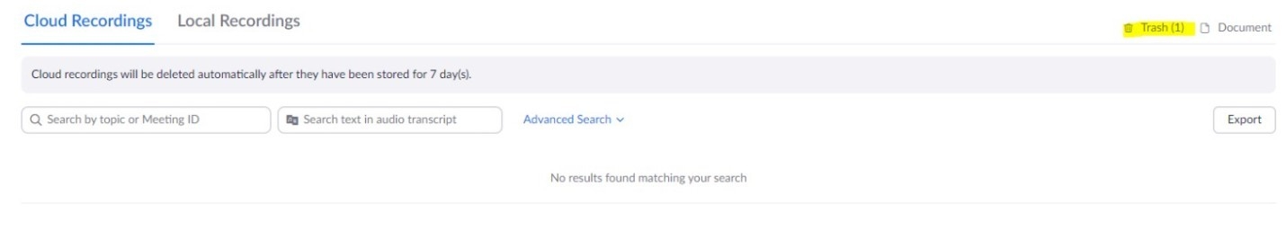 After 7 days, video files will be deleted from Zoom Cloud and moved to Trash. Instructors can recover the video files by clicking on 'Recovery'. The files will return to Cloud Recordings so that professors can download them to make copies or move them to upload further on the Cloud or other storage channels. Video files in the trash will be kept for 30 days before being permanently deleted from the system.