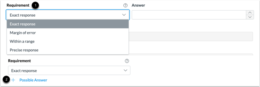 คำตอบที่ต้องการในข้อคำถามข้อนี้ สามารถเลือกได้ที่ \[1] โดยสามารถเลือกได้จาก Exact Response, Margin of Error, Within a Range, หรือ Precise Response และใส่คำตอบที่เป็นไปได้ที่ \[2]