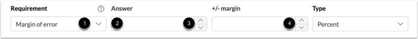 เลือก Margin of Error ที่ \[1] ใส่คำตอบที่ \[2] หรือใช้ลูกศรเพิ่มจำนวนที่ \[3] เพิ่มขอบเขตที่ \[4] และเลือกประเภทของขอบเขตได้ที่ Type ซึ่งจะมีเป็นเมนู Dropdown ซึ่ง Requirement ประเภทนี้ไม่รองรับข้อมูลที่เป็นสัญกรณ์วิทยาศาสตร์ (scientific notation)ใดๆ