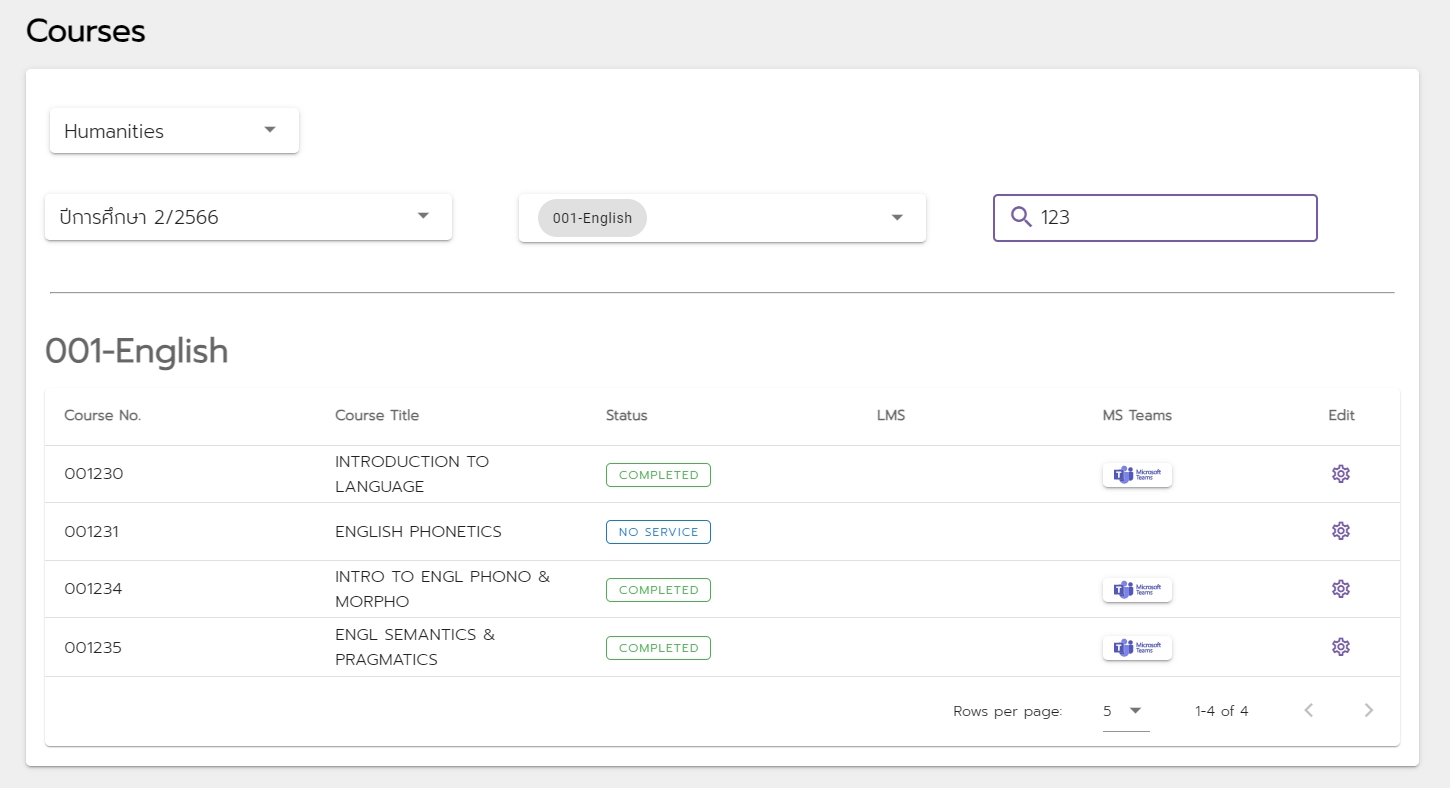 Courses Panel shows courses that an admin can manage for instructor. Use filter and search to find specific subject/course.