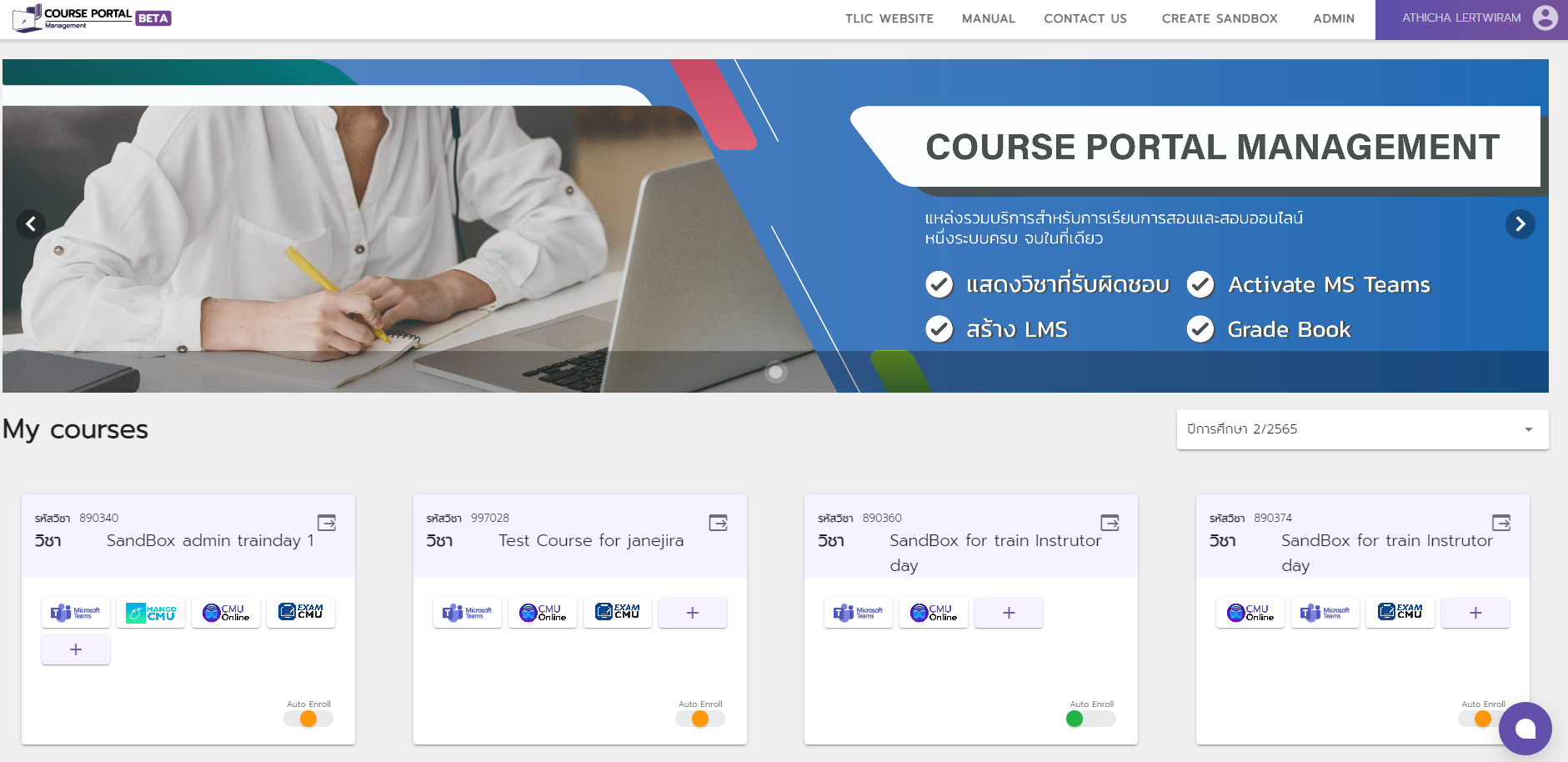 <figure><img src="https://files.gitbook.com/v0/b/gitbook-x-prod.appspot.com/o/spaces%2FZeihKhgOHcWozkqK5QzU%2Fuploads%2F1XZxSMQAMa7ERX43gHom%2Fimage.png?alt=media&#x26;token=8362036e-e2da-462c-9bb5-cf50058d0bcb" alt=""><figcaption><p>เมื่อเลือกที่โลโก้ระบบจะปรากฏรายการคอร์สที่สร้างขึ้นมา</p></figcaption></figure>