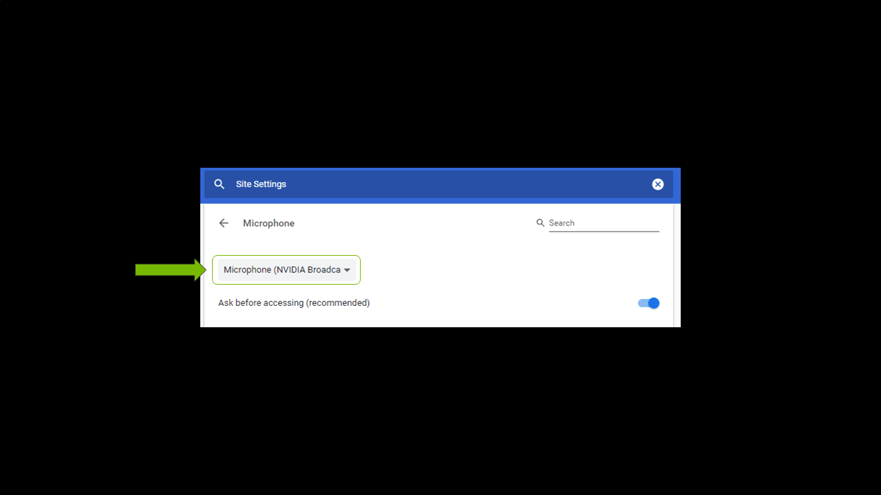ท่านสามารถเลือก NVIDIA Broadcast เป็นไมโครโฟนเริ่มต้นของท่านใน Windows เพื่อที่ท่านจะได้ไม่ต้องเปลี่ยนในทุกแอปพลิเคชัน โดยตรวจสอบให้แน่ใจว่าท่านได้เลือกไมโครโฟนที่ท่านใช้จริงใน NVIDIA Broadcast