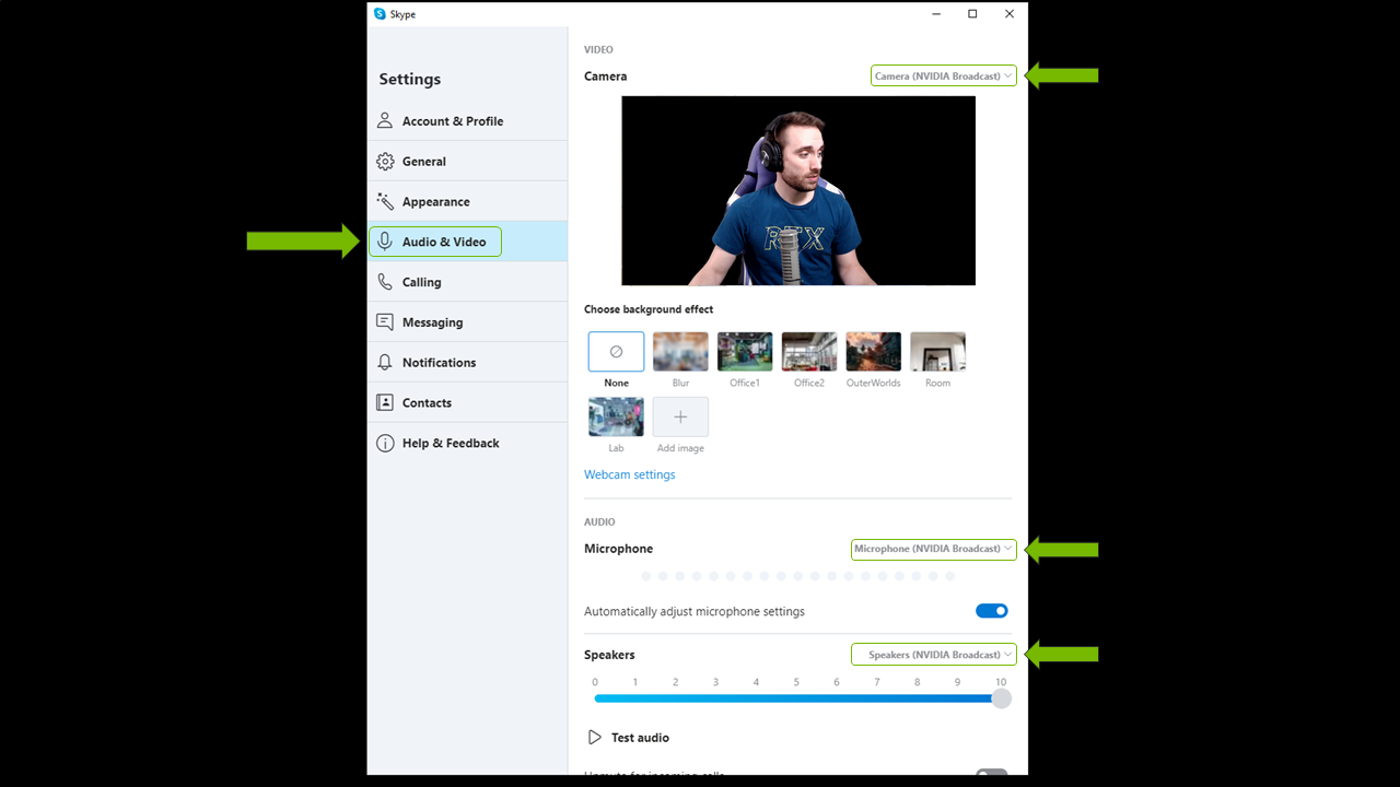 3. ทำเช่นเดียวกันในตัวเลือก Video (ตัวเลือกที่สองด้านล่างซ้าย) เพื่อเลือก Camera (NVIDIA Broadcast)