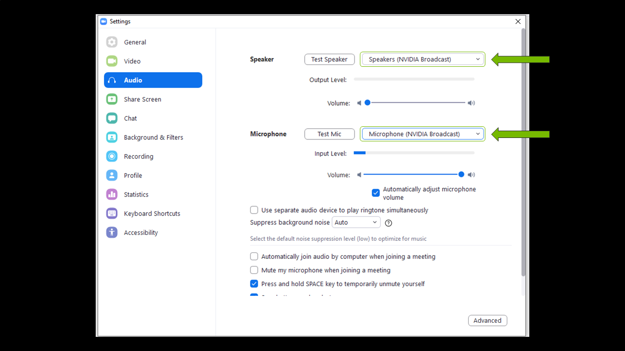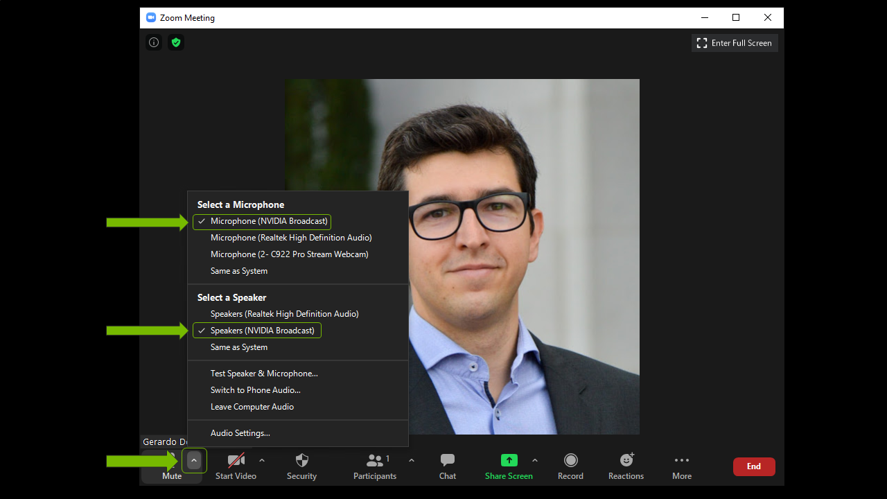 เลือก NVIDIA Broadcast Microphone and Speakers เป็นอุปกรณ์ของท่าน