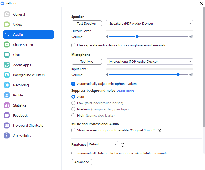* เปิดการใช้งาน "Original Sound" ในระหว่างการประชุม เมื่อเปิดการใช้งานส่วนนี้ ส่วนของ Suppress background noise จะถูกปิดการใช้งานโดยอัตโนมัติ(กรณีที่เปิดใช้งานอยู่) เหมาะสำหรับงานที่มีการแสดงดนตรีหรือสตูดิโอที่ต้องการฟังเสียงสภาพแวดล้อมให้ชัดเจนที่สุด